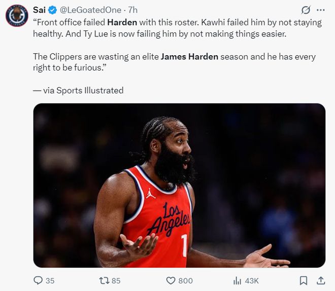 《体育画报》赛前:快船管理层打造的这套阵容辜负了哈登,伦纳德无法保持健康让哈登失望,泰伦卢也让他失望,因为泰伦卢没有让比赛变得轻松。快船正在浪费一个精英级哈登的赛季,哈登完全有理由感到愤怒。